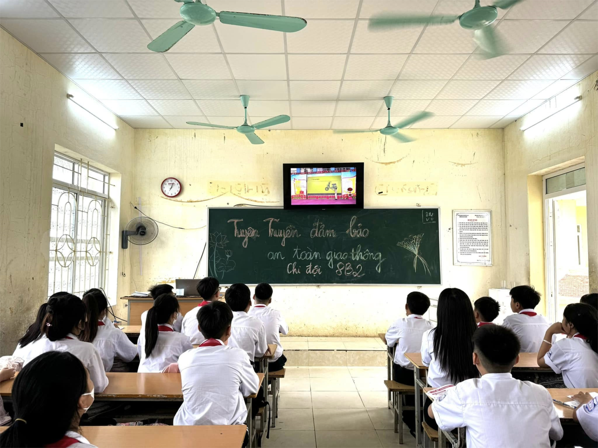 Tại tiết SHDC lớp 8B2 đã thực hiện trình chiếu, tuyên truyền các phóng sự, clip ngắn về các vi phạm của học sinh, các vụ TNGT liên quan đến học sinh đã phát sóng do phòng CMNV Sở gửi tới. GVCN đã phổ biến luật an toàn giao thông và hướng dẫn cách đeo mũ bảo hiểm đúng cách cho HS.