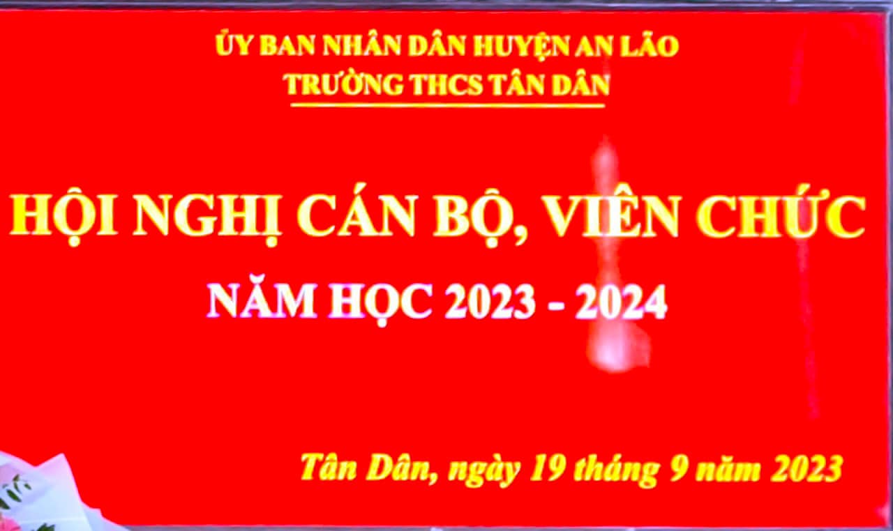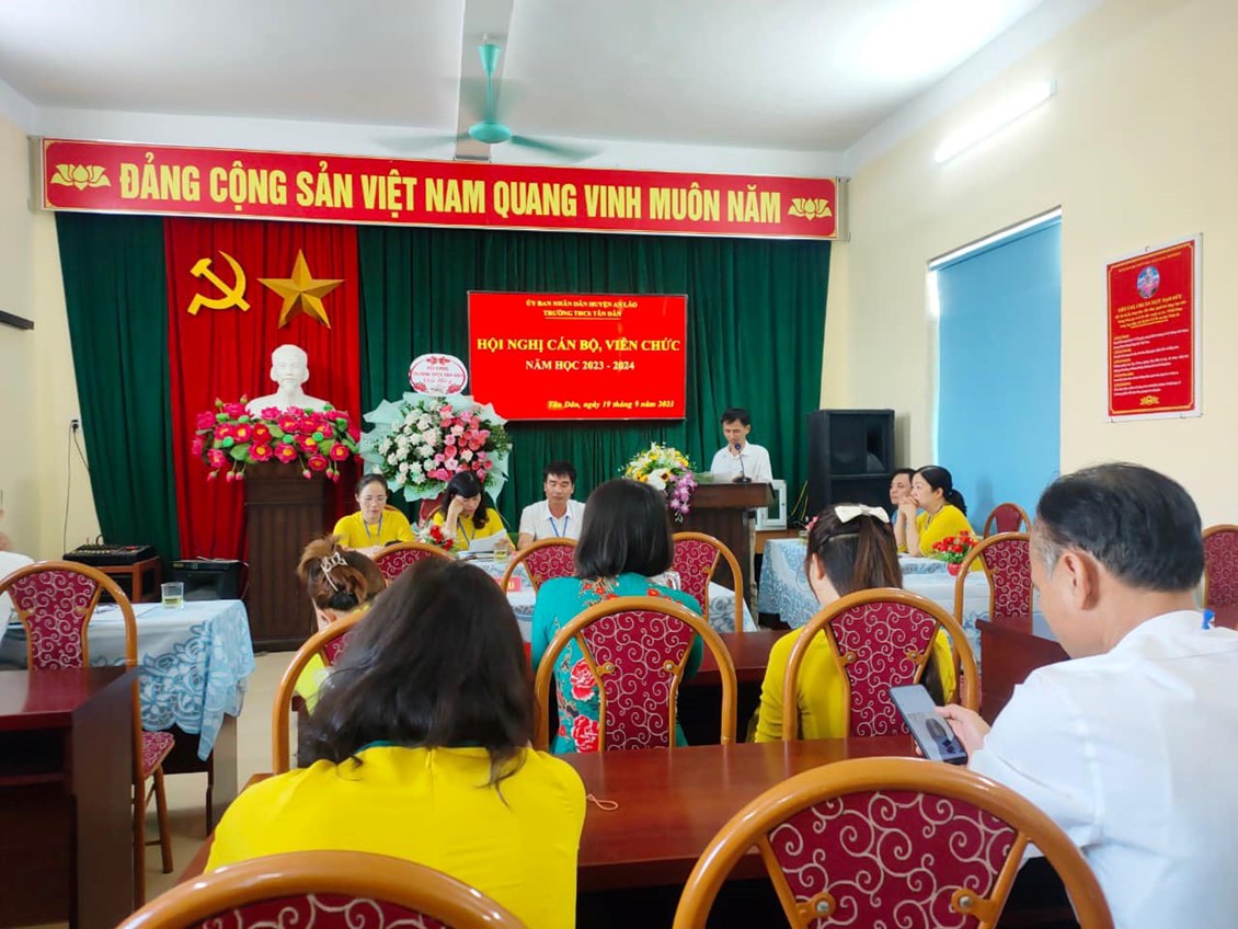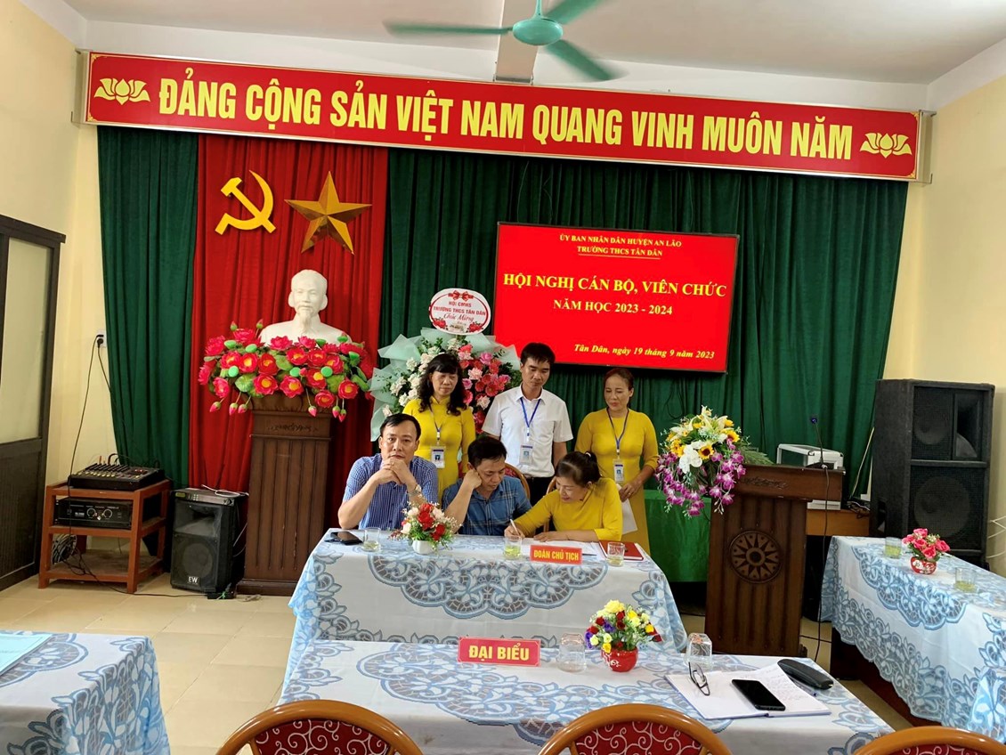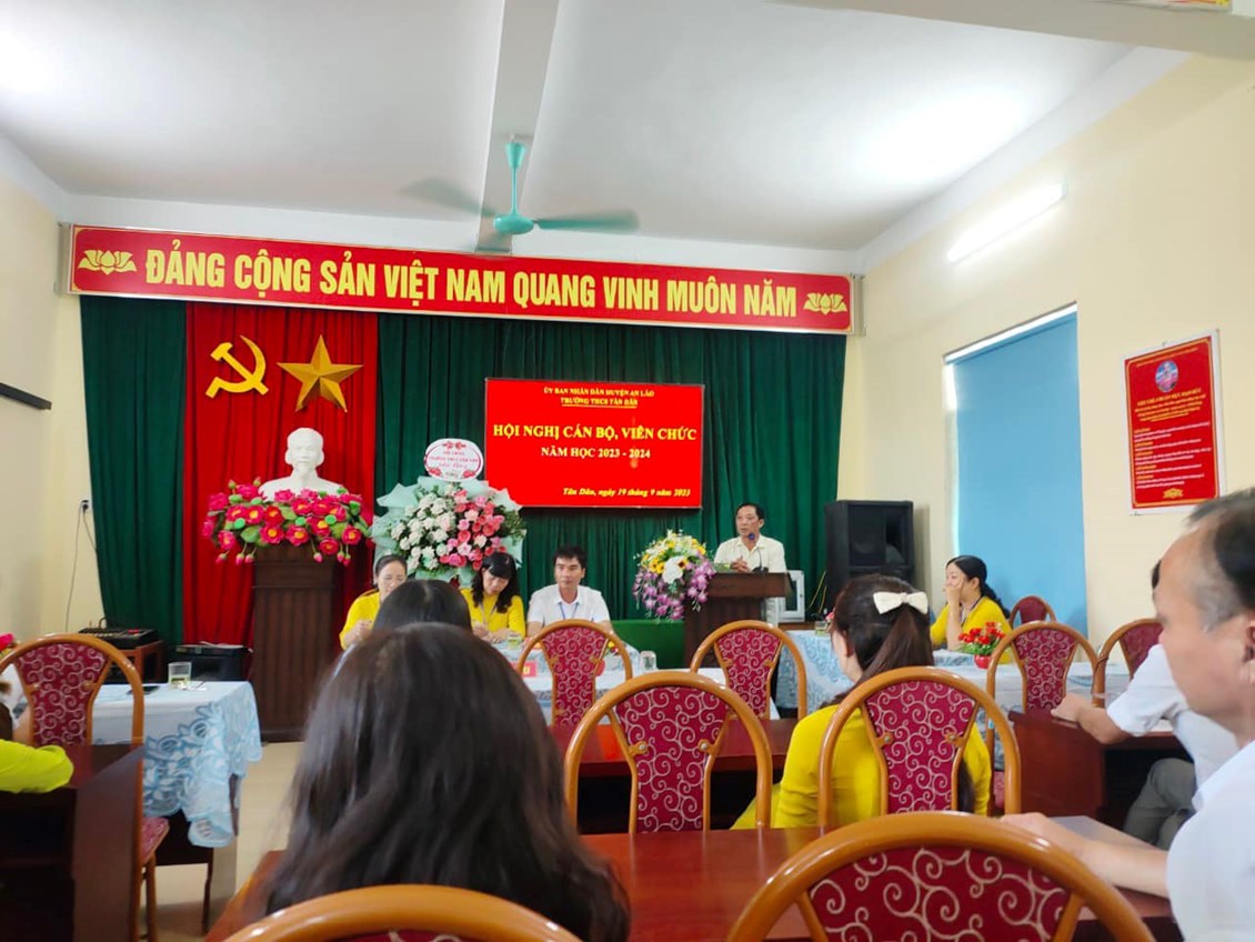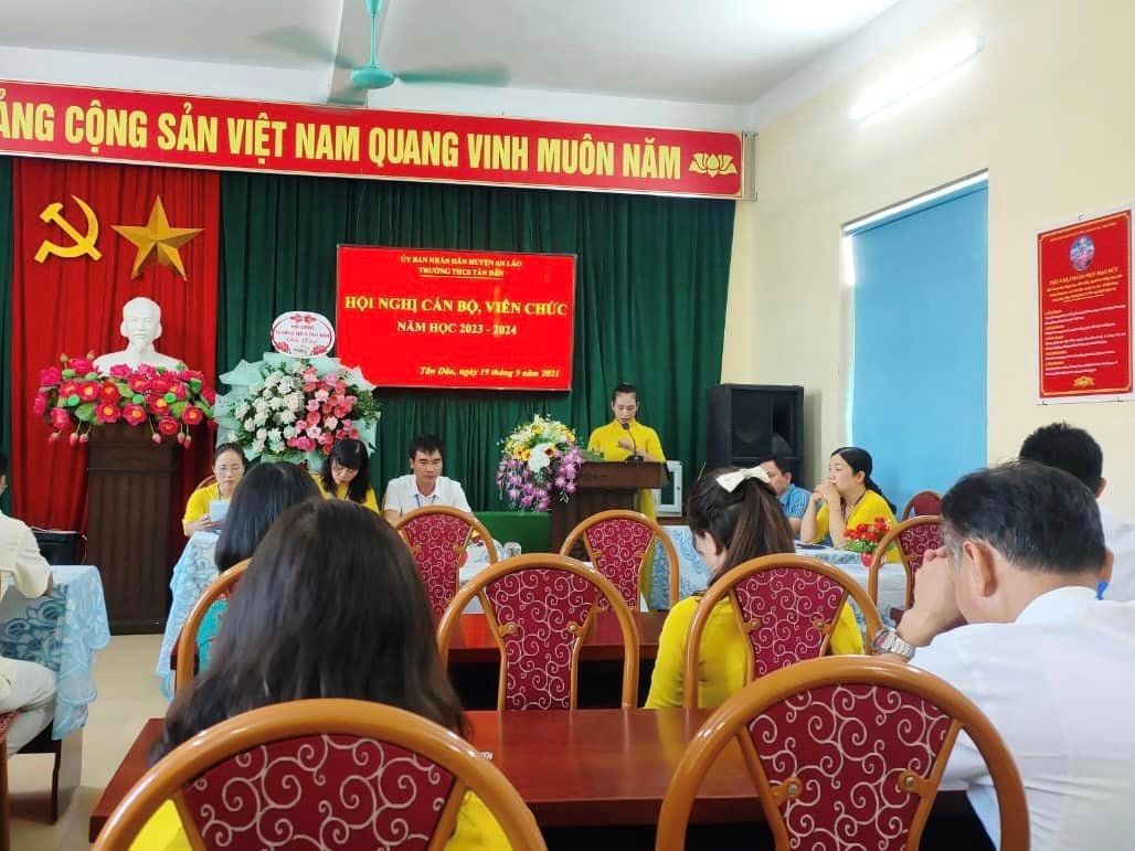 Chiều ngày 19/9/2023, trường THCS Tân Dân đã tổ chức Hội nghị cán bộ Công chức - viên chức, ký giao ước thi đua năm học 2023 -2024 nhằm đẩy mạnh và nâng cao chất lượng các phong trào thi đua, hoàn thành tốt nhiệm vụ năm học. Các tiêu chí thi đua đã được thông qua trong Hội nghị. Sau khi thảo luận, các đại biểu đã nhất trí với các tiêu chí thi đua và quyết tâm hoàn thành thắng lợi nhiệm vụ năm học 2023-2024. Tại Hội nghị, đại diện lãnh đạo nhà trường, đại diện các tổ, đại diện Công Đoàn, Đoàn thanh niên, Đội đã ký giao ước thi đua dưới sự chứng kiến của lãnh đạo Nhà trường.