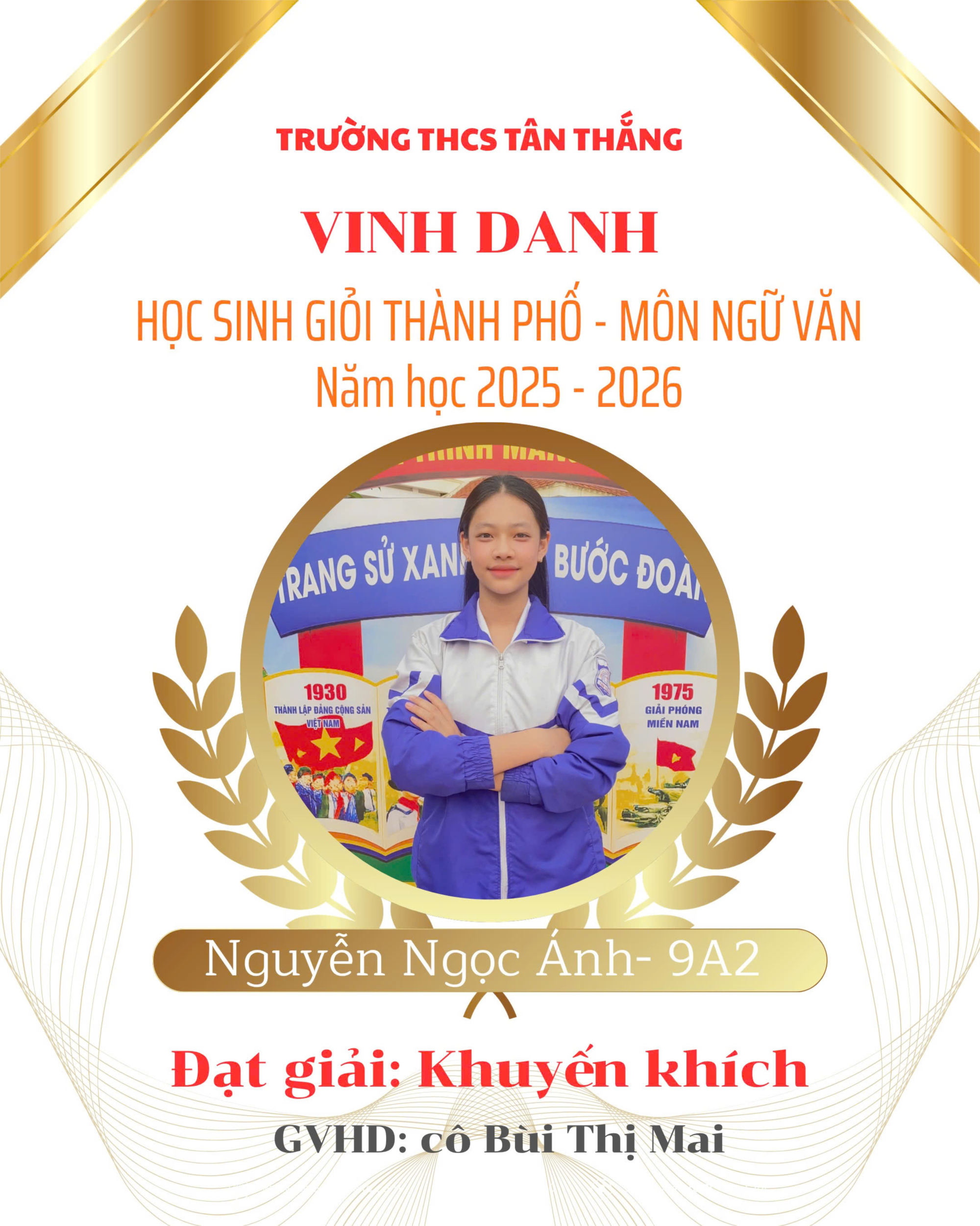 Trong kỳ thi Chọn học sinh giỏi cấp Thành phố vừa qua, ngôi trường THCS Tân Thắng đã đón nhận một tin vui rực rỡ. Em Nguyễn Ngọc Ánh, học sinh lớp 9A2, đã xuất sắc vượt qua trăm thí sinh để mang về giải thưởng cao quý trong môn Ngữ văn.