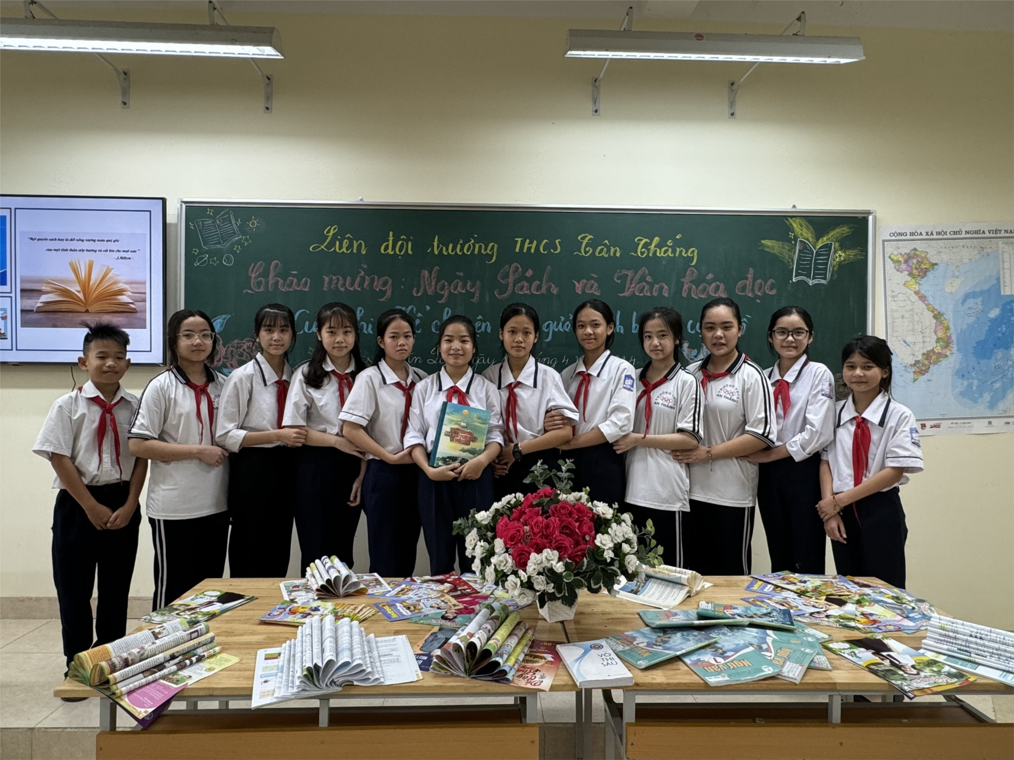 Chào mừng Kỷ niệm 70 năm Chiến thắng lịch sử Điện Biên Phủ; 83 năm ngày thành lập Đội TNTP Hồ Chí Minh và kỷ niệm 134 năm ngày sinh Chủ tịch Hồ Chí Minh. Hưởng ứng ngày hội văn hóa đọc Việt Nam, Liên đội trường THCS Tân Thắng đã phát động cuộc thi cuốn sách em yêu, kể chuyện theo tấm gương anh bộ đội cụ Hồ. Hơn một nghìn đội viên, thanh niên trong toàn liên đội đều tích cực hưởng ứng, tham gia nhiệt tình, hiệu quả.
