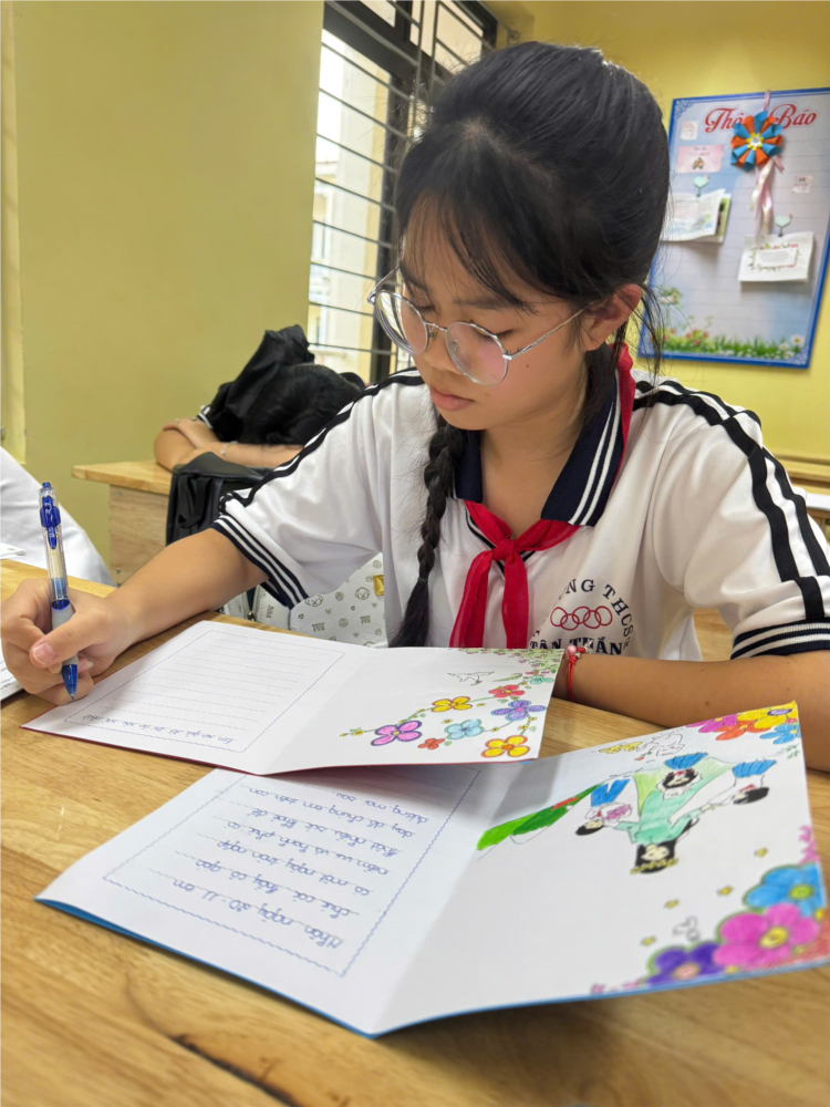 Mỗi tấm thiệp là một tác phẩm nhỏ chứa đựng tấm lòng tri ân sâu sắc của các bạn học sinh. Dưới đôi tay khéo léo và sự tưởng tượng phong phú, những tấm thiệp được trang trí đầy màu sắc, kèm theo những lời chúc chân thành, giản dị mà ý nghĩa.