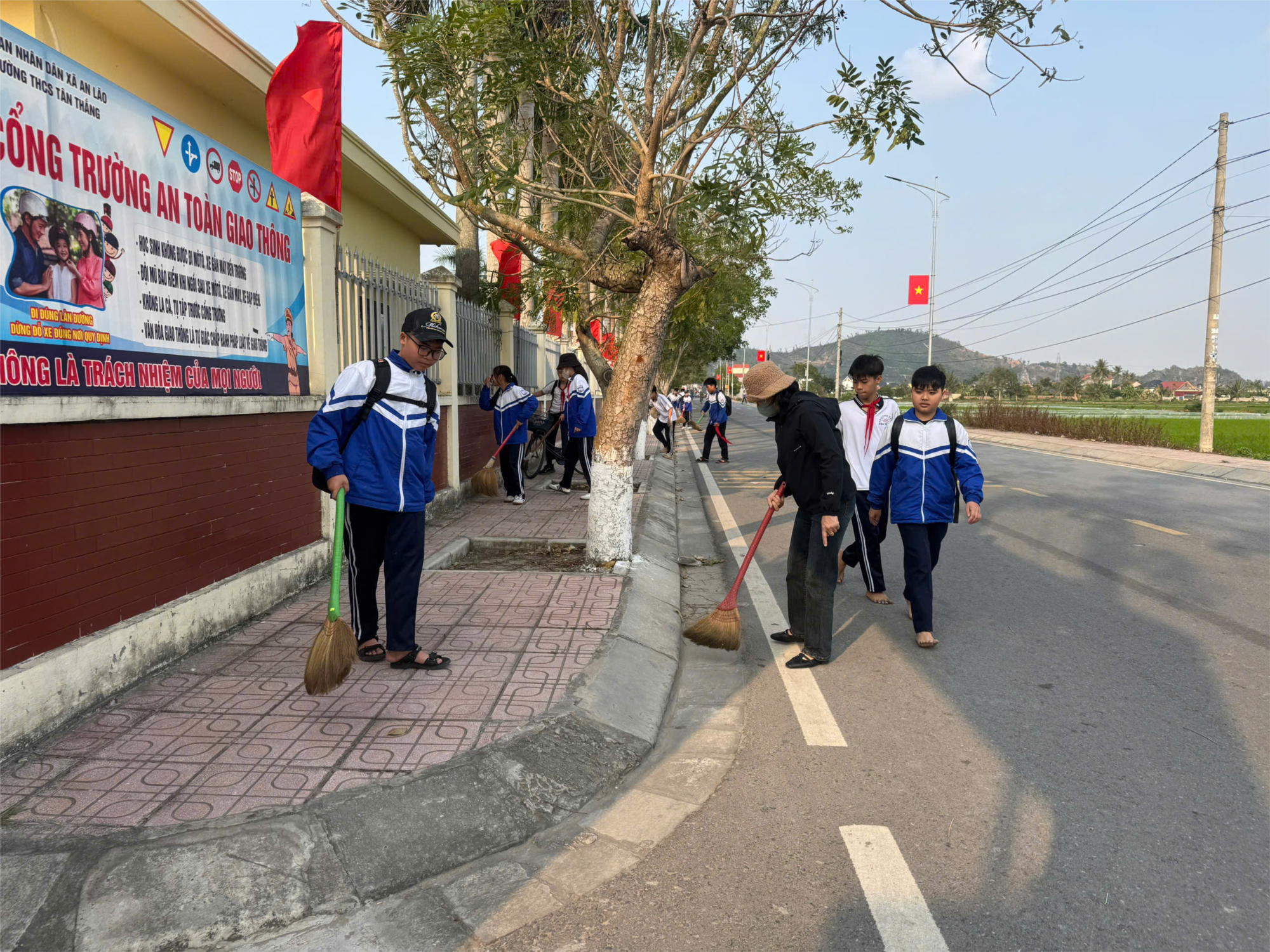 Học sinh Trường THCS Tân Trắng tích cực quét dọn, thu gom rác thải tại khu vực vỉa hè và ven đường xung quanh trường học.