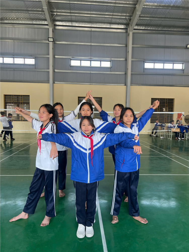 Trong bức hình là câu lạc bộ võ thuật của trường THCS Tân Thắng. Các bạn học sinh mặc đồng phục võ phục xanh, xếp thành hàng ngay ngắn và tập luyện những động tác cơ bản đầy khí thế. Phía sau là khu nhà đa năng hiện đại, khang trang, tạo không gian tập luyện rộng rãi và thoáng mát. Hình ảnh này thể hiện tinh thần rèn luyện thể chất, ý chí kiên cường và sự đoàn kết của tập thể học sinh trong phong trào thể dục thể thao của nhà trường.