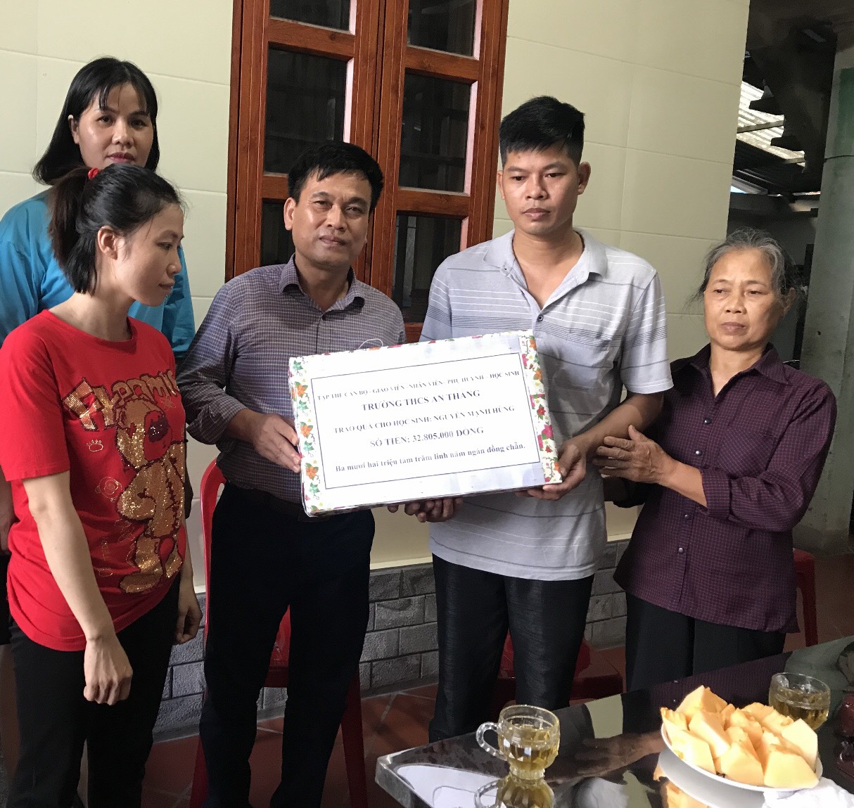 Ảnh BGH nhà trường trao số tiền ủng hộ cho gia đình học sinh