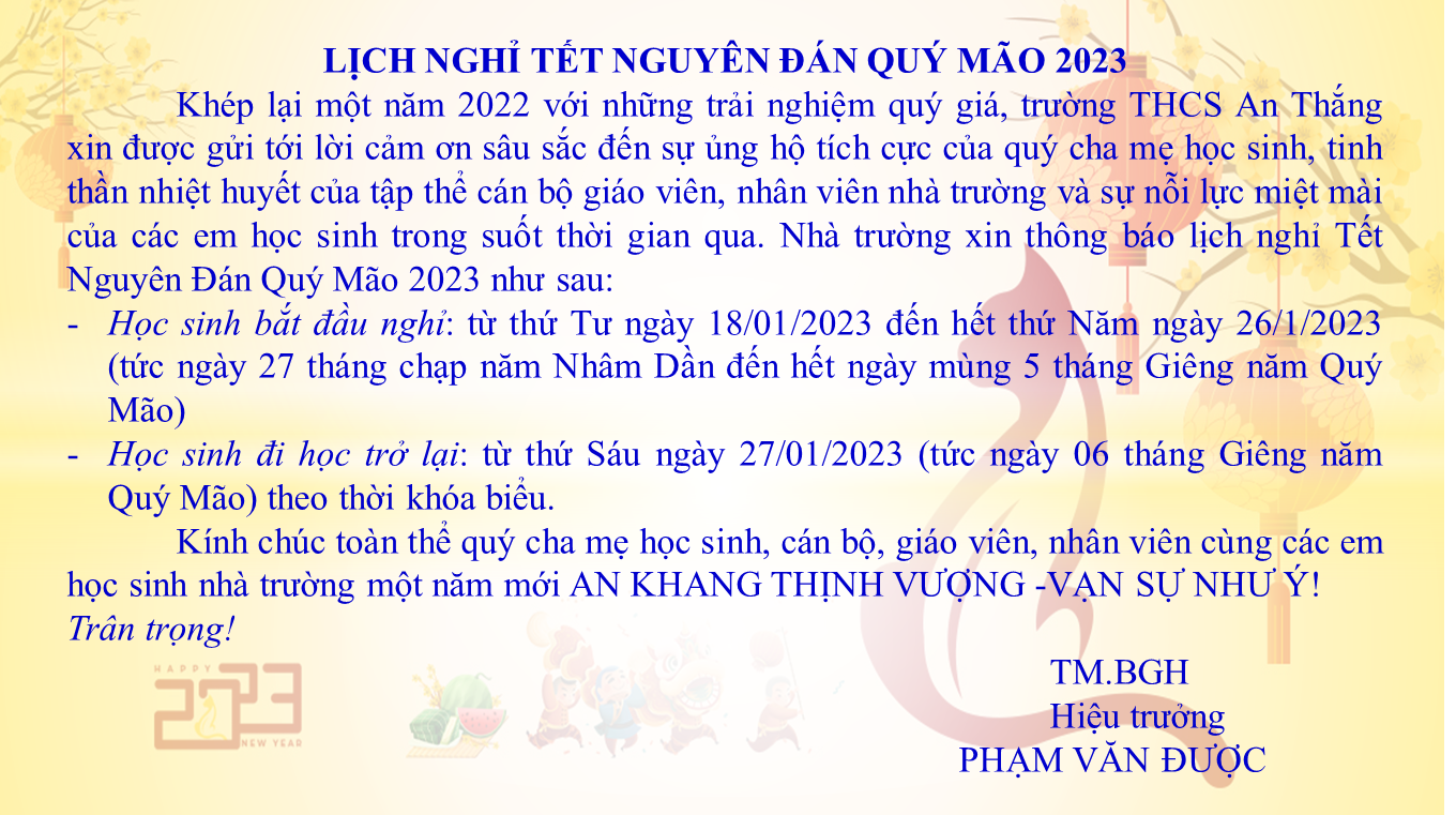 Khép lại một năm 2022 với những trải nghiệm quý giá, trường THCS An Thắng xin được gửi tới lời cảm ơn sâu sắc đến sự ủng hộ tích cực của quý cha mẹ học sinh, tinh thần nhiệt huyết của tập thể cán bộ giáo viên, nhân viên nhà trường và sự nỗi lực miệt mài của các em học sinh trong suốt thời gian qua. Nhà trường xin thông báo lịch nghỉ Tết Nguyên Đán Quý Mão 2023 như sau: