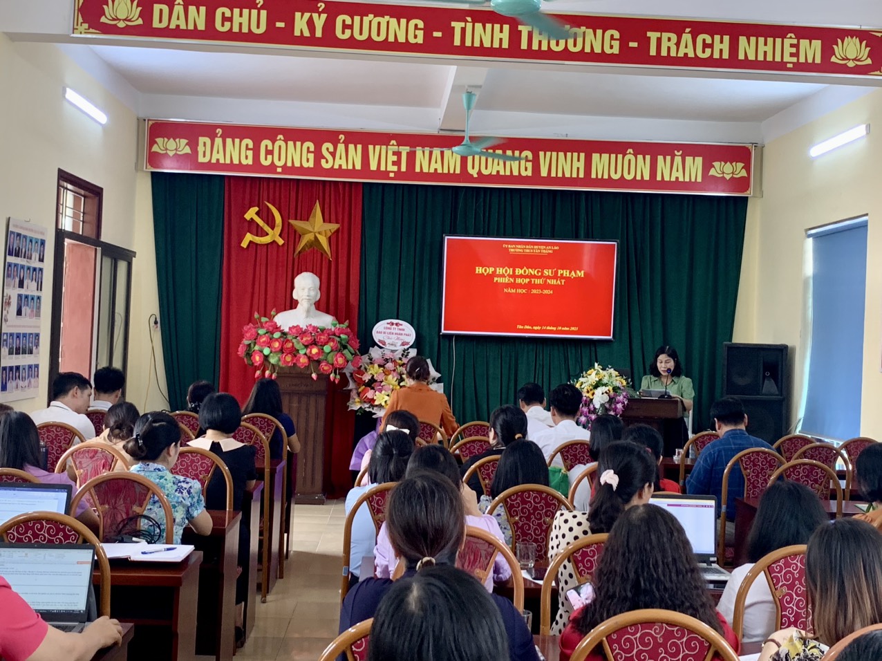 Chiều ngày 14/10/ 2023 Trường THCS Tân Thắng tổ chức Họp hội đồng phiên họp thứ nhất. Qua buổi họp hội đồng đã triển khai các quy chế, quy định làm việc của trường THCS Tân Thắng mới, qua cuộc họp cũng đã nhận được sự chỉ đạo của cấp trên, cũng như BGH đã được nghe các ý kiến đóng góp của CBGV- CNV trong việc tham gia xây dựng vào tiêu chí thi đua của nhà trường. Bên cạnh đó Công đoàn nhà trường đã tổ chức liên hoan kỉ niệm 93 năm ngày thành lập Hội liên hiệp phụ nữ Việt Nam (20/10/1930 - 20/10/2023)